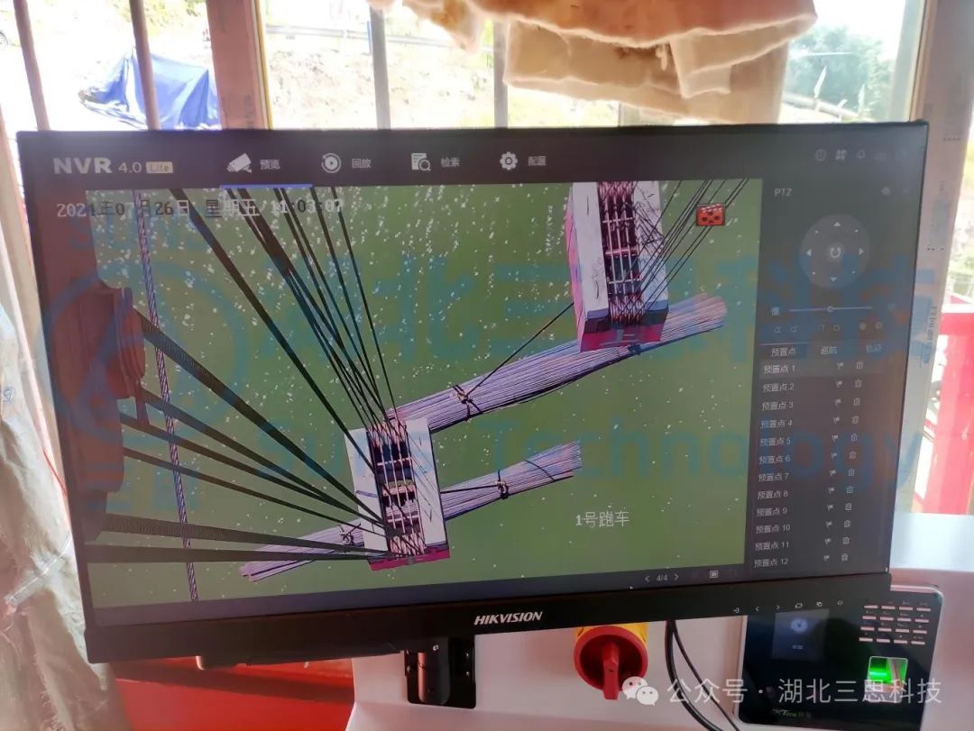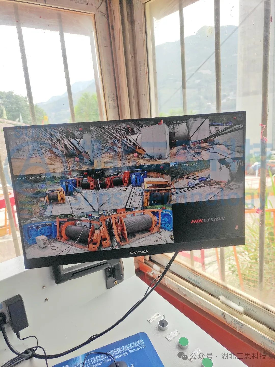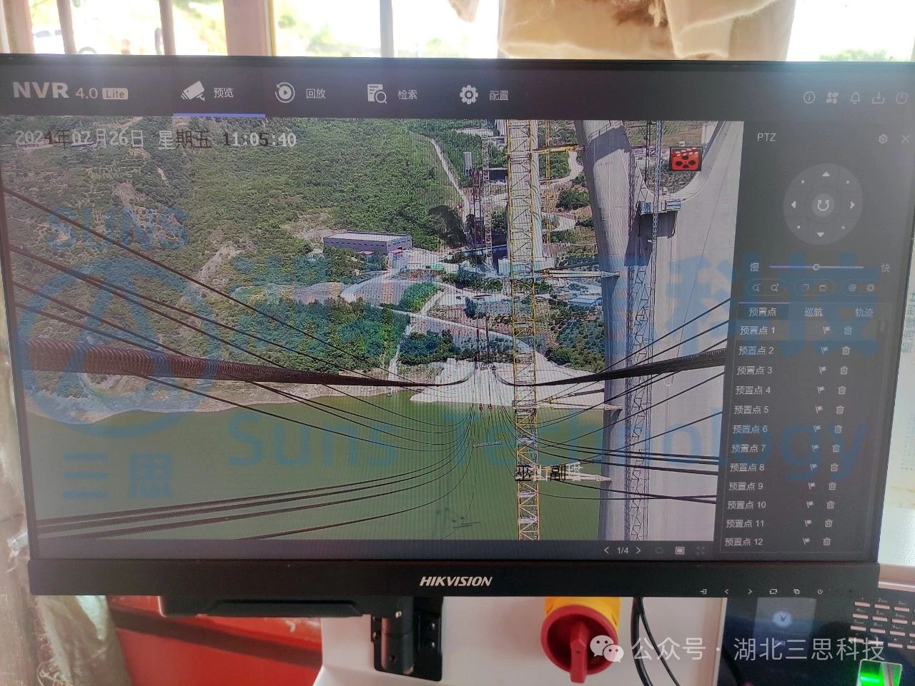 現(xiàn)場(chǎng)多臺(tái)槍機(jī)分別安裝在卷?yè)P(yáng)平臺(tái)附近,監(jiān)視卷?yè)P(yáng)的工作情況;兩個(gè)塔頂 各安裝多個(gè)球形攝像機(jī)用于鳥(niǎo)瞰纜索吊區(qū)域施工情況。