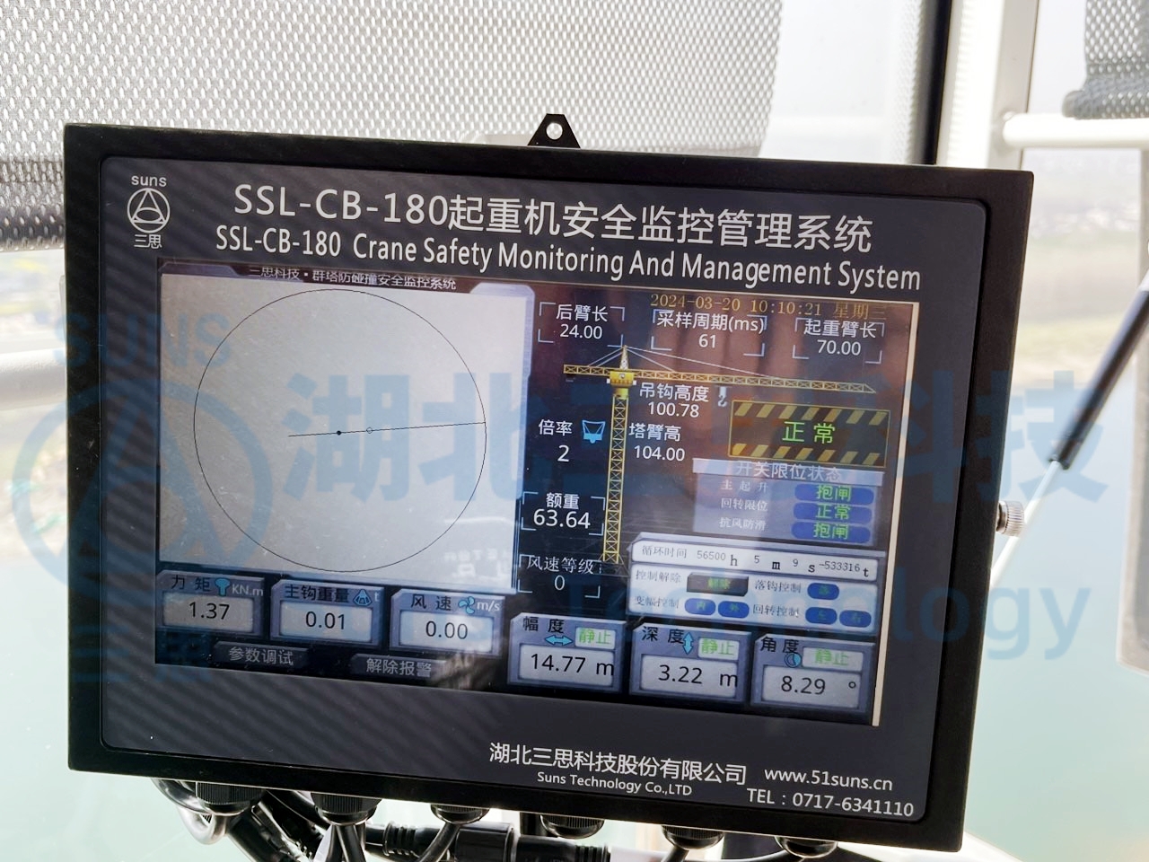 主機采用10英寸顯示屏,能實時顯示工地現(xiàn)場塔機運行狀況,通過無線網(wǎng)絡(luò)把各種傳感器采集的參數(shù)實時上傳到智慧工地監(jiān)管平臺,實現(xiàn)系統(tǒng)監(jiān)管。