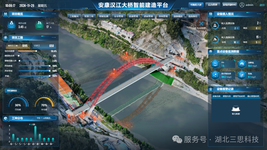 平臺主要分為3D前端可視化、工程概況、智慧工地、智能監(jiān)測、安全管理、質(zhì)量管理、進度管理等8個模塊,主要綜合了互聯(lián)網(wǎng)、三維建模、視頻監(jiān)控、BIM、智能化等現(xiàn)代技術(shù),融合了智慧工地可視化、橋梁3D建模,施工進度可視化、工程管理、安全管理、質(zhì)量管理、進度管理、數(shù)據(jù)分析、設(shè)備管理和告警等關(guān)鍵功能,建設(shè)數(shù)字化工程管控平臺,為安康漢江大橋的安全生產(chǎn)管理提供信息化支撐。通過可視化場景、數(shù)據(jù)管理、分析和合規(guī)性支持,幫助橋梁項目和設(shè)施管理者更高效地監(jiān)測、管理和維護基礎(chǔ)設(shè)施,降低成本、風險和停機時間,推動項目成功交付和可持續(xù)性發(fā)展。