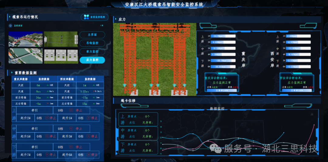 由湖北三思科技自主研發(fā)的纜索吊集中智能控制系統(tǒng)正式亮相本次載荷試驗。本系統(tǒng)對主承重索、牽引索、纜風索、扣索、背索等索力及起重拉力、塔偏、錨碇與錨梁位移、卷揚機溫度等進行實時監(jiān)測,將視頻與數(shù)據(jù)平臺結(jié)合,直面施工現(xiàn)場卷揚機工作情況,真實反映吊裝過程中受力情況及塔偏,有異常情況系統(tǒng)會自動報警,保證纜索吊系統(tǒng)的安全穩(wěn)定性,為整個吊裝過程提供安全強有力保證。