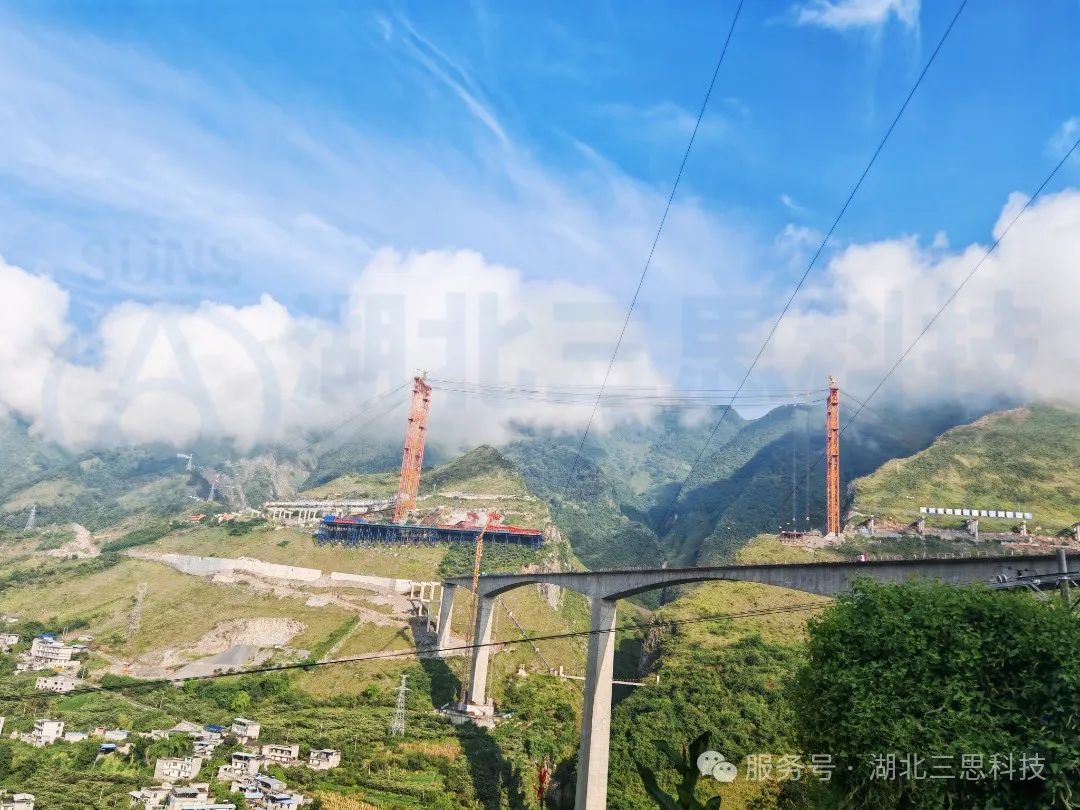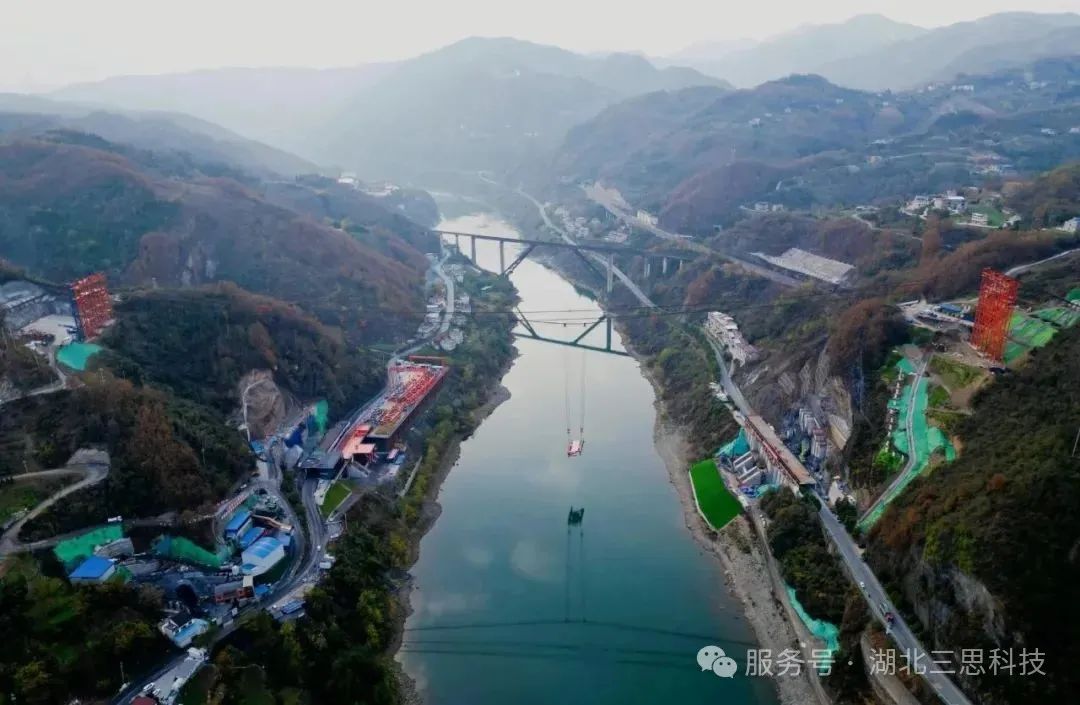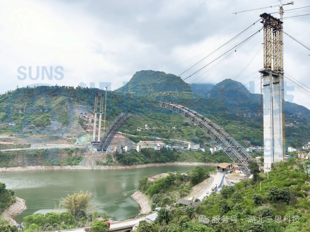 大河溝特大橋位于宜賓市屏山縣新市鎮(zhèn)境內(nèi),是一座跨徑為293.4米的鋼管混凝土中承式拱橋,主拱拱肋共64個節(jié)段,拱圈總計用鋼量約3300噸。大河溝特大橋為U型峽谷間的隧間橋,由于所處地勢陡峭險峻,施工建設(shè)面臨三大挑戰(zhàn)。一是拱座處于近90度垂直峭壁,機械設(shè)備無法開展作業(yè),前期進場施工困難;二是大橋起吊高度距谷底高差約為230米,纜索吊裝系統(tǒng)施工困難;三是運輸?shù)缆房v坡有6處大于16%,最大縱坡可達21%,運輸構(gòu)件總高度達到8米,構(gòu)件運輸?shù)缆防щy。為確保大河溝特大橋右線主拱順利實現(xiàn)合龍,項目建設(shè)團隊全力推進技術(shù)攻關(guān)工作。一是工藝新,運用先栓后焊的工藝,實現(xiàn)了全橋臨時螺栓全連接,以工藝創(chuàng)新實現(xiàn)精準(zhǔn)對接。二是結(jié)構(gòu)新,采用“單側(cè)索塔+兩岸錨碇”形成獨塔雙跨吊裝系統(tǒng),創(chuàng)造性地依據(jù)地形特征量身定制施工方案。三是系統(tǒng)新,使用由湖北三思科技自主研發(fā)的智能纜索吊智能集中控制系統(tǒng),通過APP遠程控制纜索吊實現(xiàn)拱肋一鍵吊裝到位,提高了吊裝系統(tǒng)的高效性。
